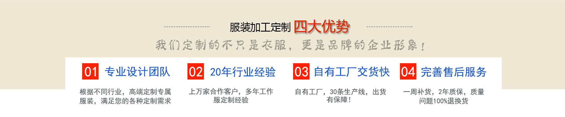 服裝加工網是一家及設計、生產、銷售為一體的專業服裝生產型企業, 根據客戶需求定制西服襯衫工作服大衣棉服等產品,近二十年工作服職業裝定做經驗積累, 工期短交貨及時,免費提供團體定制上門量體服務,送貨上門,免費修改,完善的售后服務, 滿足您的各種定制需求!